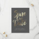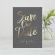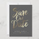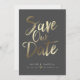 This design features the words "save the date" in a gold handwritten script. Couple's names and wedding details are displayed below and can be customised. Background colour is also customisable.