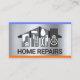 A faux silver cover features a creative rooftop building with grey shade pillars that incorporate handyman construction tools. The silver layer is encapsulated by blue and brown layers at the top and bottom of the card. Each handyman tool represents some of the service that you might offer e.g. The hammer-measuring tape can represent remodeling works, the roller brush-ladder for painting, the water drop-wrench for plumbing works and the bulb for electrical service. Below all this is the business name "HOME REPAIRS" which you can change.