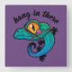 Colourful cartoon gecko licking his eyeball with the phrase Hang In There. Keywords: lizard, eye, animal, cute, cartoon, gecko, reptile, tongue, inspiration, inspirational, motivation, motivational, help, advice, hang