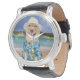 A watch with a 90 lb. yellow Lab, in a Hawaiian shirt, on a tropical beach.  Four main positions are marked by hang loose signs.  This will hopefully keep you light hearted during the day.  You can change the watch options.  The beach background is a publicdomainpicture.
