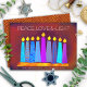 “Peace, love & light.” A playful, modern, artsy illustration of boho pattern candles in a menorah helps you usher in the holiday of Hanukkah. Assorted blue candles with colourful faux foil patterns overlay a rich deep brick red orange textured background. Faux copper diamond pattern foil on a brick red background for the reverse side. Feel the warmth and joy of the holiday season whenever you send this stunning, colourful, personalised Hanukkah flat greeting card. Matching envelopes, stickers, tote bags, wrapping paper, serving trays, home décor, and more are also available. Send this to someone special!