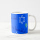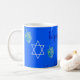This mug has a Hanukkah design of dreidel, Star of David, and “Happy Hanukkah” on a blue background. Great for the season.