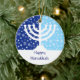 The perfect ornament for the interfaith family. A Hanukkah menorah is silhouetted against a field of dark and light blue stars and snowflakes. Your personalised message goes below. Also can be used as fan, light or blind pulls or wall decor. Available with matching products.