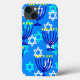 This phone case has a Hanukkah design of menorahs and stars on a blue background. Great for the season.