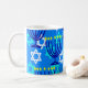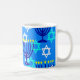 This mug has a Hanukkah design of menorahs and stars on a blue background. Great for the season.