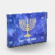A glowing gold Hanukkah menorah superimposed on a blue and white fractal image reminiscent of snowflakes in a storm. Add your own text. Chag Sameach!