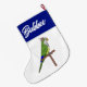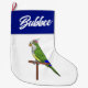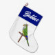 A blue and white Hanukkah stocking with a green Quaker parrot. The name can be changed.