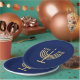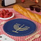 Happy Hanukkah Party Jewish Holiday decorative Menorah. Hanukkiah Symbol. Jewish Holiday Chanukahs Decoration with traditional Chanukah decorative symbols - Navy Blue color, colorful dreidels Chanukah wooden toys (spinning top), star of David and neon blue glowing lights illustration. Hanukkah Festival of lights Event Decoration. Jerusalem, Israel. Crafts & Party Supplies > Party Supplies > Tableware > Paper & Party Plates Judaica Modern Design. For a festive Hanukkah 2025 table setting.