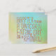 A slogan in colourful writing on a background of different colours, the slogan says: Happier Than A Unicorn Eating Cake On A Rainbow.