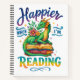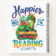 Vibrant, colourful design featuring an open book, colourful dragon, and flowers. The colourful text reads: "Happier when I'm reading". This design is available on a wide variety of products.