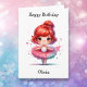 Personalised Birthday card for a little girl. Pretty watercolor little red haired girl ballerina in pink tutu. Inside is a colouring page. All text on the card can be changed in the personalise area.
