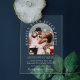Elegant elopement or private wedding announcement and reception clear acrylic invitation featuring your photo in an arch frame and "Happily Ever After Party" in classic white serif typography. Under your photo, personalise your announcement and party or reception details and add your names in a signature-like white script.