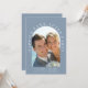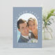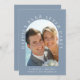 Elegant dusty blue elopement or private wedding announcement and reception invitation. The front features your photo in an arched frame and "Happily Ever After Party" in elegant white typography. Under your photo, add your first names, wedding date and location. On the reverse, personalise your announcement and celebration invitation in more detail and add your names in a signature-like script.
