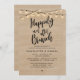Planning a happily ever after brunch celebration, your wedding day? Invite your beloved guests with this "Happily ever after brunch", in modern rustic script design (cottage brown wood, string lights background) themed, indicating the date, time, venue, and RSVP details.