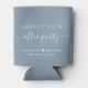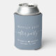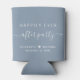 A custom dusty blue can cooler for your elopement or post-wedding reception or party with "Happily Ever After Party" in a mix of simple modern white typography and a chic white script with swashes, your first names joined by a heart and your wedding date.