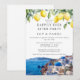 This elegant happily ever after party wedding invitation, featuring watercolor lemons and a Santorini, Greece scene can be personalized with your information in chic typography. Designed by Thisisnotme©