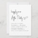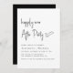 Minimalist black and white wedding reception invitation featuring "Happily Ever After Party" in a chic modern script, your details in simple lettering, and your names in classic serif typography.
