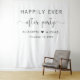 Elegant white wedding reception welcome sign and photo backdrop tapestry featuring "Happily Ever After Party" in simple typography and a stylish script, your first names joined together by a heart and your reception date.