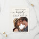 Modern light cream wedding announcement. The front features your photo, "Save The Date For Our Happily Ever After" in a mix of simple typography and a chic script with swashes and your first names and wedding date joined together by a heart. On the reverse side, personalise your save the date details and add your names in a signature-like script.
