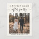 Modern light cream elopement or private wedding announcement combined with a reception invitation. The front features your wedding day photo and "Happily Ever After Party" in a mix of simple typography and a stylish script with swashes. Under your photo you can add your first names and wedding date. On the reverse you can personalise your message and invitation in more detail, input your wedding website URL address to create a QR code that your guests can scan to obtain more information and to RSVP online, and add your names in a signature-like script.