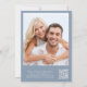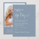 Minimalist dusty blue wedding reception invitation featuring "Happily Ever After Party" in a chic white script, your invitation in classic white serif typography, and your names in a signature-like script. On the back, upload your photo and input your wedding website address to create a QR code that your guests can scan to RSVP online and obtain additional details.
