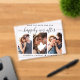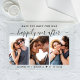 Modern clear acrylic save the date announcement featuring a 3 photo collage, "Save The Date For Our Happily Ever After" in a mix of simple typography and a chic script with swashes and your first names and wedding date joined together with a heart.