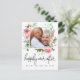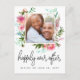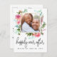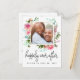 Your favoriate couple's photo is framed in gold and pink watercolor peonies. Happily Ever After is written in a decorative script below. Begins on and your wedding date follow. The wedding details are on the back of the postcard. Pretty template for the DIY Bride. Affordable, modern and very on trend.