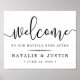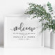 Welcome guests to your wedding with our sweetly chic poster, available in several sizes. Design features black typography on crisp white with "welcome" at the top in elegant handwritten calligraphy script, and "...to our happily ever after" and your names and wedding date beneath.