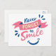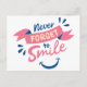 Brighten someone's day with this fun pink and blue happy face quote card. The happy attitude quote "Never, forget to smile" is printed in fun pink and blue fonts with a pink banner and a happy face. Happy smiley face cards are perfect for * greetings - hello, thinking of you, love, miss you, get well, birthdays * businesses * weddings and parties * stationery gifts - tie a pretty ribbon around fa few cards. Please scroll down to view matching products you may enjoy.