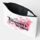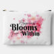This accessory pouch for a woman, features the inspirational quote "Happiness Blooms From Within" and pretty pink watercolor flowers. Use this pouch as a cosmetic bag, toiletry bag, for a travel kit, pencil case and more.