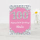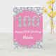 Happy 100th Birthday Pink and Silver Glitter Card with personalised name. For further customisation, please click the "Customise it" button and use our design tool to modify this template.