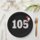 105th birthday party with bold black and white happy and number 105 text on black with party balloon bouquet.