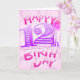 Happy 12th Birthday card. Color: Mostly pinks and purples. Greeting inside: Happy birthday, May this day always be a special one to remember.
