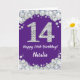 Happy 14th Birthday Purple and Silver Glitter Card with personalised name. For further customisation, please click the "Customise it" button and use our design tool to modify this template.