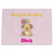 Large gift bag for 1st birthday gift: This cute gift bag for a little girl turning one features a happy puppy, a cake and balloons. Personalize it with the birthday girl's name to make it even more special. The back is full of little puppies joining the party :-) Also check out my matching birthday cards in various sizes. Also available for little boys in blue. Designed by Best Baby Gifts - given with love.