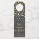 NewParkLane - Glamourous Happy 2024 Wine Label Hanger, with 'Happy two thousand and twenty four' in elegant brush/ script typography in faux gold, with a gold sparkles / confetti against a dark grey background.