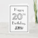 The front of this luxurious Roaring Twenties art deco inspired birthday-themed greeting card design features the message “Happy 20th Birthday,” along with a personalised recipient name. The number “20th” on the front has a fancy lined appearance, and there is also a lined border. The inside has a customisable birthday greeting message, or could perhaps be cleared and left blank if a message is to be written by hand instead. A stylish, customised birthday greeting card like this might be used to acknowledge somebody’s twentieth birthday. [~Z0000641]