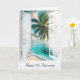 A swing hanging from a bent palm tree over turquoise ocean water scene in an open window for 25th anniversary.