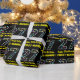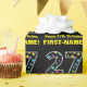 This fun birthday-themed wrapping paper design features a large number "27", filled with a pattern of decorative star shapes of various sizes and colours. It also features the message "Happy 27th Birthday,", and a customisable name. The background is coloured black. Birthday themed wrapping paper like this might be a fun way to wrap a gift or present being given to somebody who is celebrating their 27th birthday. [~Z0000429]