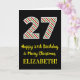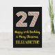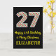 The front of this fun and simple Christmas-themed and birthday-themed December 25th birthday greeting card design features a large number "27" with a red, white, and green stripes pattern, along with the message "Happy 27th Birthday & Merry Christmas,", and a customisable name. The background of the front is coloured black. The inside features a personalised birthday greeting message, or could perhaps be cleared and left blank if a message is to be written by hand instead. A customisable birthday card like this might be a fun way to send birthday wishes to somebody who is celebrating their twenty seventh birthday and who was also born on December 25th (Christmas Day). [~Z0000405]