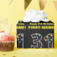 This fun birthday themed wrapping paper design features a large number "31" filled with a pattern of star shapes having various sizes and colours, along with the message "Happy 31st Birthday,", and a personalised name. The background is coloured black. Wrapping paper like this might be used when giving a gift or present in honour of somebody’s thirty first birthday. [~Z0000429]