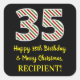 This simple and fun Christmas themed and birthday themed December 25th birthday sticker design features a large number "35", with a red/white/green stripes pattern. It also features the message "Happy 35th Birthday & Merry Christmas,", and an editable name. The background is coloured black. Stickers like this might be a fun way of preparing gifts or presents that are being given to somebody who was born on Christmas Day (December 25th) and who is celebrating their thirty fifth birthday. [~Z0000409]