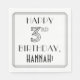This elegant 1920s/1930s era inspired art deco look birthday themed paper napkin design has the message “HAPPY 3RD BIRTHDAY,”, along with a custom recipient name. The number “3RD” has a fancy geometric lined appearance, and there is also a lined border around the birthday greeting message. Paper napkins like these might be used at a party for somebody who is celebrating their third birthday. [~Z0000644]