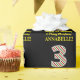 This simple and fun Christmas themed and birthday themed December 25th birthday wrapping paper design features a large number "3" with a red, white, and green stripes pattern, along with the message "Happy 3rd Birthday & Merry Christmas,", and a customisable name. The background is coloured black. Wrapping paper like this might be used when wrapping presents that are being given to somebody whose third birthday falls on Christmas Day (December 25th). [~Z0000406]
