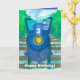 A custom birthday greeting card featuring a happy man in a blue steam train travelling on tracks through the trees illustrated with watercolor. Nice to customise the card with specific age and message!