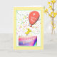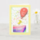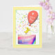 A cute and festive birthday card with my design of a baby chicken standing on a birthday cake holding a balloon that says "4 years old!". Verse inside.