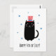 Happy fourth of July card featuring a black cat wearing a patriotic hat with stars and stripes. The cat is surrounded by blue stars. Text: happy 4th of July!