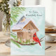 This hand-painted watercolor features a charming birdhouse adorned with a Happy Birthday banner, as a tufted titmouse and a cardinal stop by on a crisp winter day. Soft seasonal details and gentle colors create a warm, thoughtful scene, making it a lovely birthday piece for someone celebrating their 50th birthday!
