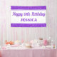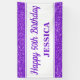 This happy birthday banner features faux purple glitter. Personalise it with a name.
