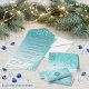 An elegant menu with a teal blue and foil pattern and your unique birthday number in glitter and gold.